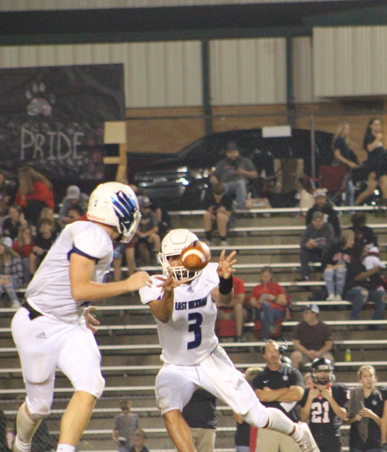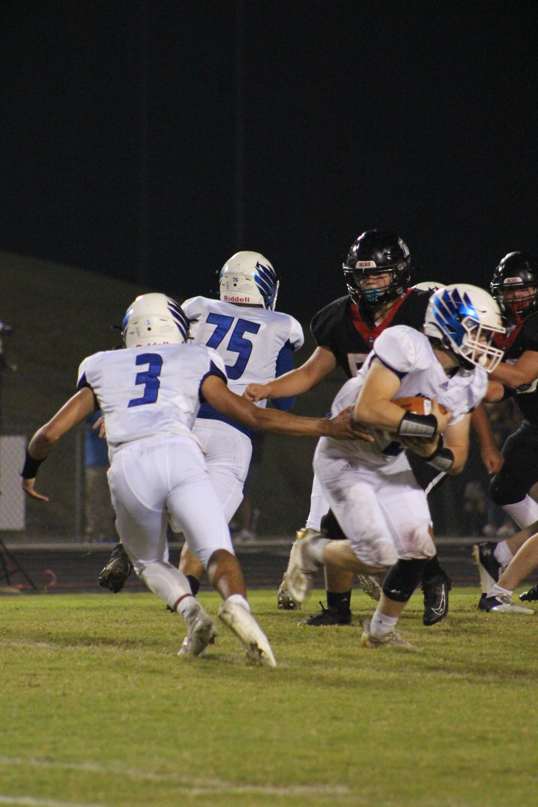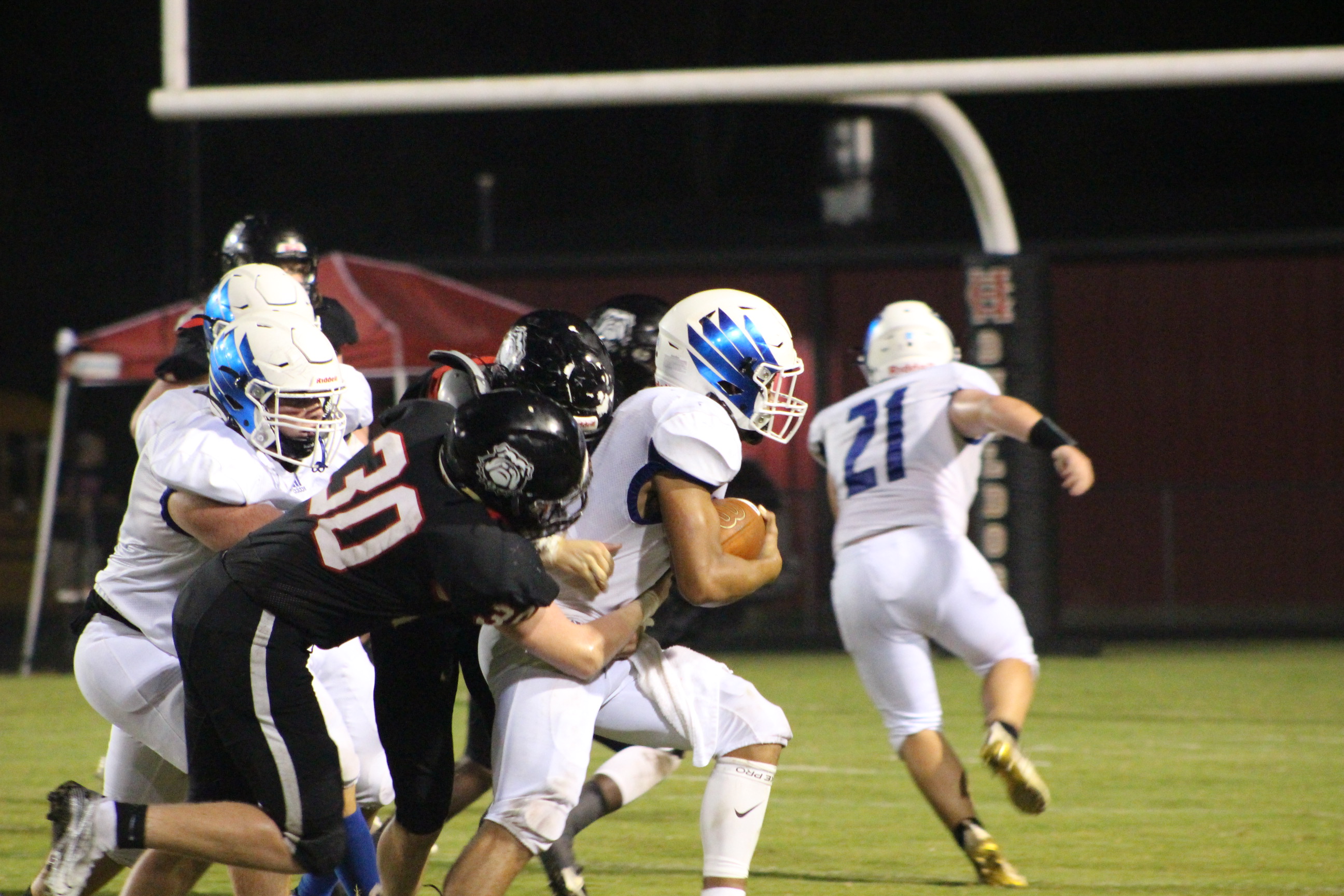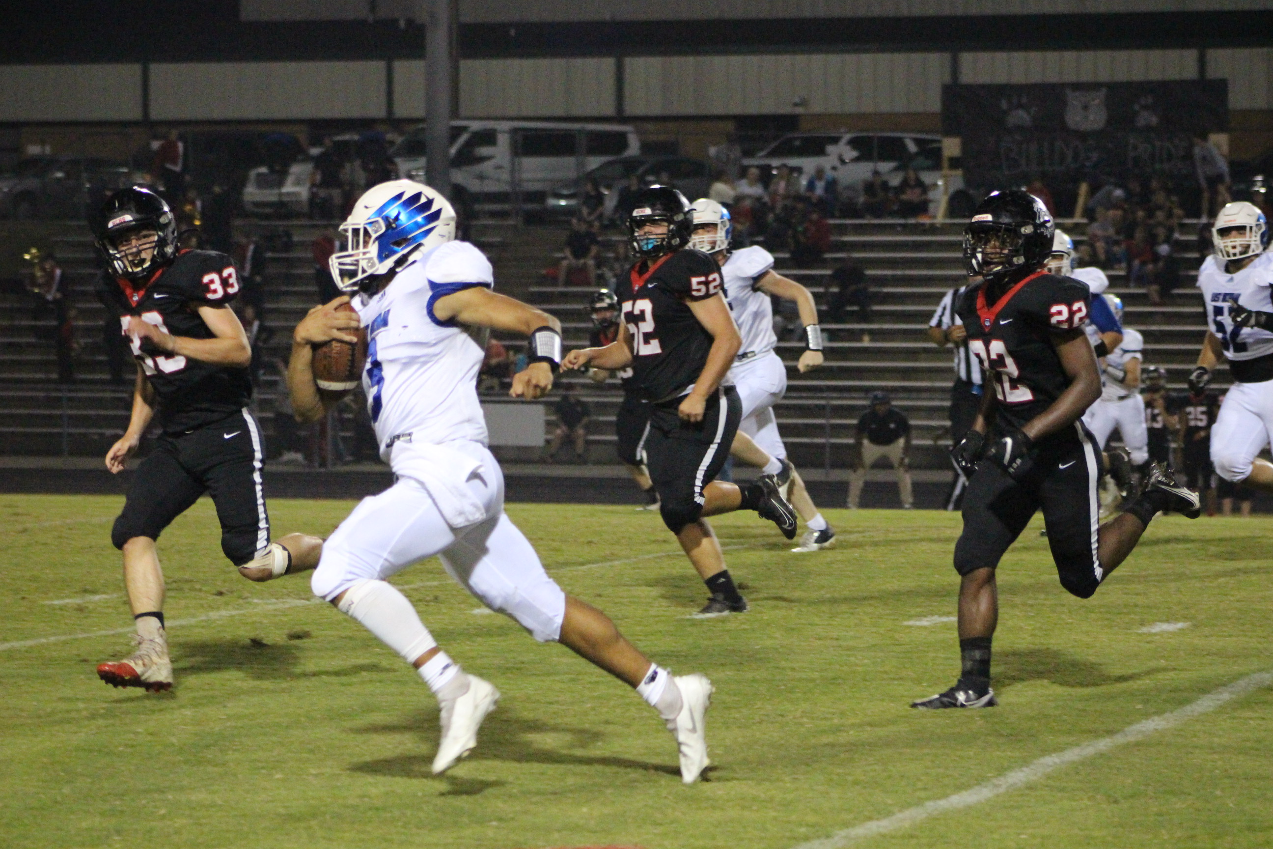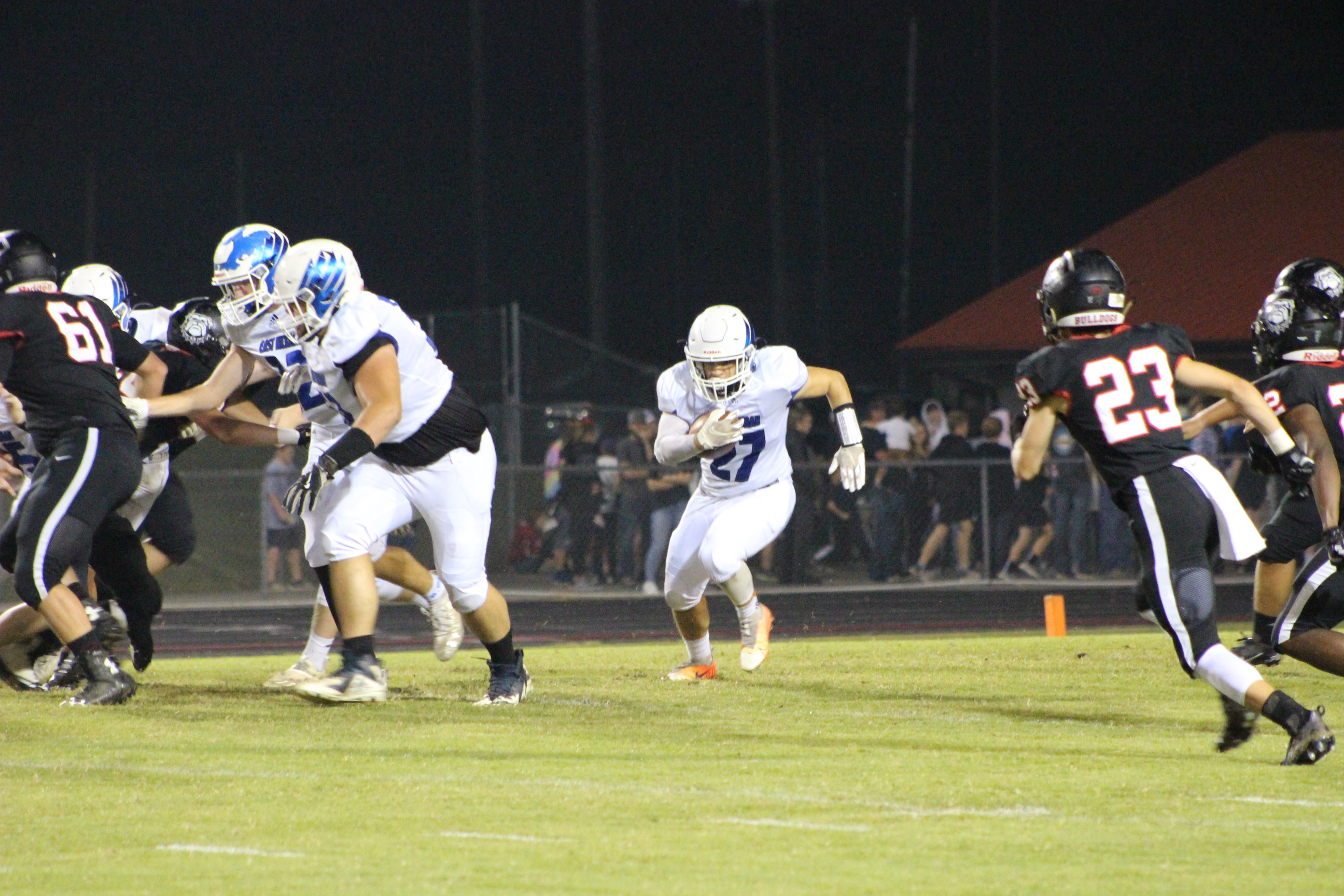 Both sides were on the edge of their seats throughout the game with each team having a close call game; however, the Eagles persevered, with feathers “unruffled,” scoring 43 to 40—the Bulldogs surrendered the rest of the time in the fourth quarter. During the game, Ethan Irwin #22, wearing Parker Nicholson’s jersey, smacked the ball out of the air when Bulldogs kicked the ball for their PAT.